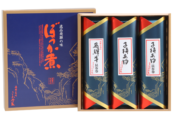飛騨牛と子持あゆの詰合せです。二種類の昆布巻と卵いっぱいの子持あゆのボリューム満点の詰合せです。